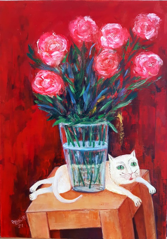 White cat and flowers2021year 70x50cmOriginal Painting Oil on Canvas 4000$